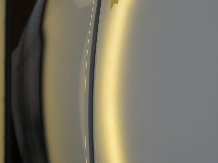 ヘコミの位置は左リアドアの前方で、大きさは7cmの縦長です。ドアパンチによるものだと思われます。ヘコミの深いところ一直線上にキズが見受けられます。
