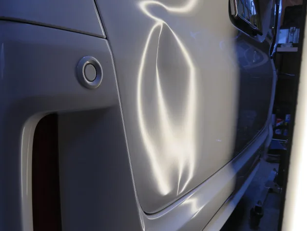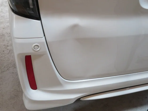 ヘコミの場所はリアゲートの左下部で、20cm超の大きさです。