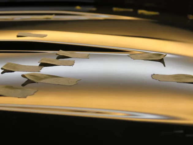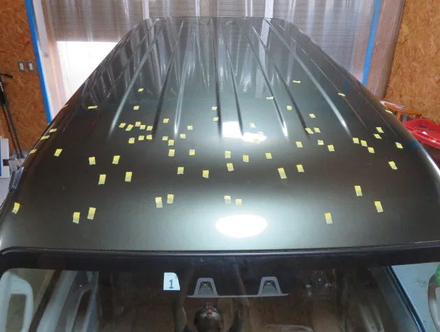 このお車はカーポートの下に駐車してあったのですが、雹が斜めに降ったためカーポートに入り込み、車体半分ほどにヘコミができてしまいました。雹は多くの場合斜めに降るので、ボディ側面のパネルがへこむことも多いです。